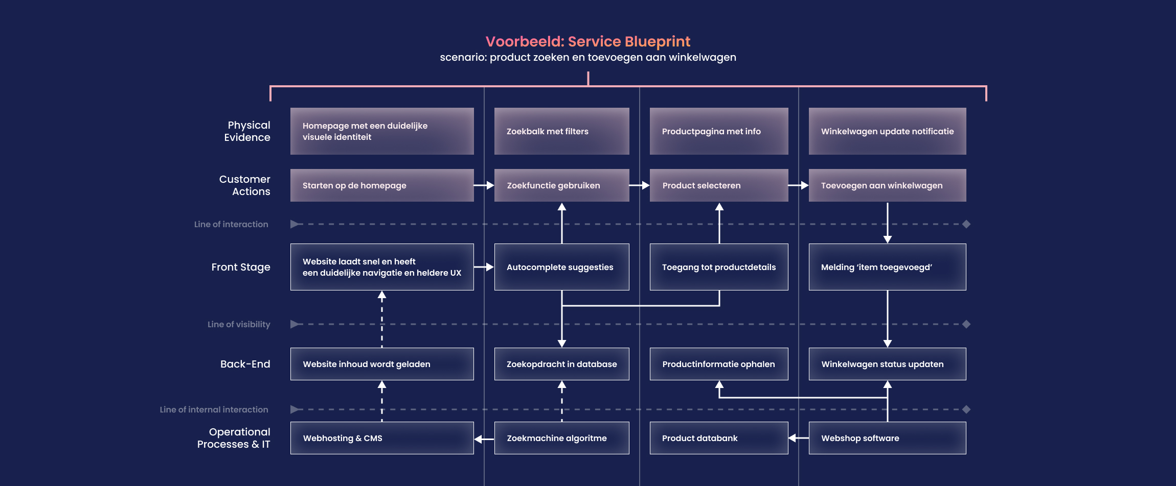 Het eindresultaat is een compleet plaatje van hoe de ervaring aan de eindgebruiker wordt aangeboden. Een service blueprint is een krachtig document dat een high-level overview geeft van de ervaring, en tegelijkertijd een gedetailleerde weergave laat zien van wat er achter de schermen gebeurt, van moment tot moment. Als je niet goed in kaart hebt wat er achter de schermen speelt binnen je organisatie, is het lastig om waardevolle aanpassingen door te voeren voor je eindgebruikers.