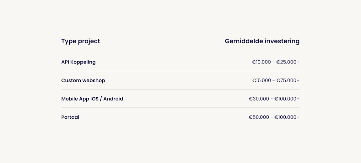 Om je toch alvast een idee te geven over investeringen, zie je hieronder een grove indicatie. Let op: Dit gaat om een gemiddelde investering. Afhankelijk van jouw wensen kan de investering ook zeker lager of hoger uitvallen.